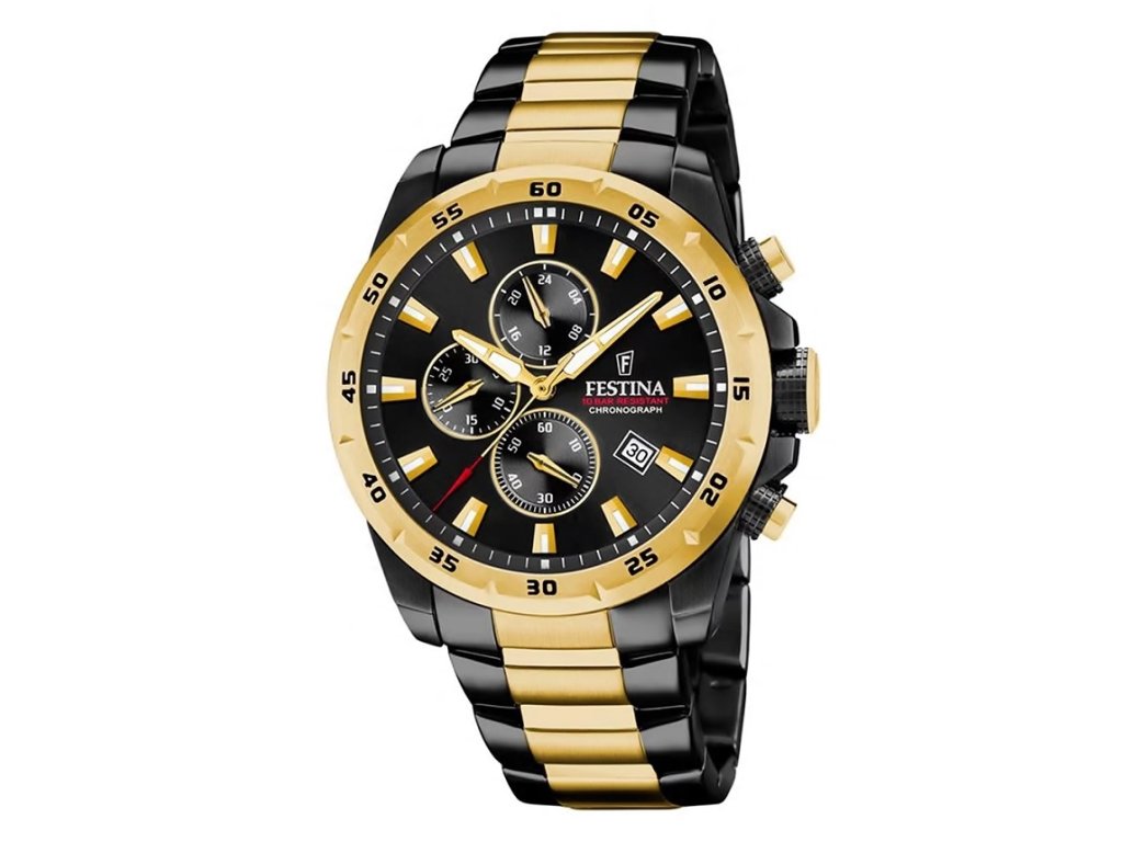 Sportovní Festina F20563/1 Sport chronograph 45mm na Vás zapůsobí mimo jiné i svým nadčasovým vzhledem. černá || zlatá barva řemínku a skládací spona jsou již pouhou tečkou za dokonalostí tohoto modelu.| Kategória: | Pánske hodinky |